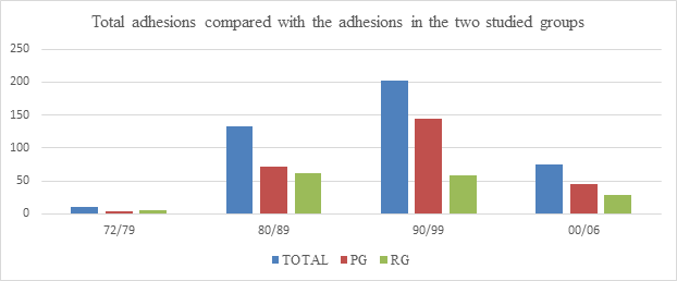In Graph 2 we compare the number of adherences to the CPRP of the PG and RG in relation to the total number of women who adhered to the physicians’ prescription in the almost four decades studied. We found that, between 1972 and 1979, there were few adherences because there was still no consensus among physicians on the safety of including the practice of physical exercises for the treatment and prevention of cardiovascular diseases for both sexes. In the following decade, there was a significant growth in the number of adherences in both groups (PG and RG) because the guidelines already included physical exercise among the therapies for the prevention and rehabilitation of cardiovascular diseases. During 80’s even with the growth in the number of gyms and the increase in advertising encouraging the need to practice exercises, sedentary middle-aged women in PG and RG still opted for the safety of specialized clinics. This growth trend in the total number of adhesions was confirmed in the following decade, however, curiously, it was more significant in the PG when compared to the RG.