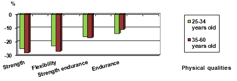 Figure 1 The dynamics of the decrease in the level of development of physical qualities of 25-60 years old men.
