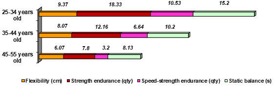 The results of women aged 35-44 compared with similar results of women aged 25-34 in the flexibility test decreased by 13.9%, while in the age category 45-55 years – almost two times, 35.2%. In the strength endurance test, group II of women reduced their performance compared to group I by 33.7; III-rd – by 57.5%. Accordingly, speed-strength endurance decreased by 36.9% and 69.6%; and static equilibrium – by 32.9% and 46.5%. As you can see, the most rapid regression in women occurs in terms of strength indicators; the quality of flexibility lasts the longest, then the static balance. Summarizing the above stated, we can observe that the changes that occur in the body of women with age, in the absence of additional physical activity, lead to a significant decrease in physical preparedness, which, of course, affects their health and but also the working capacity.
