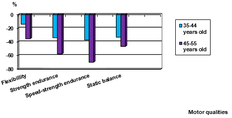 Figure 3 Dynamics of the level of decrease in the development of motor qualities of women aged 25-55.