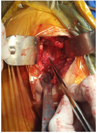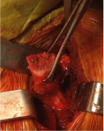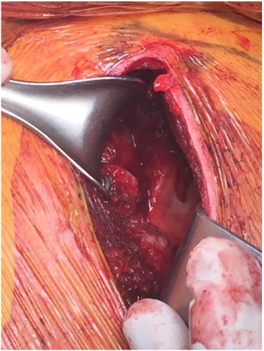 A shoulder arthrotomy is performed exposing the glenoid region with the defect, which is prepared for the placement of the bone graft. For glenoid exposure, the subscapularis muscle is identified, and a longitudinal incision of its fibers is made, developing a plane between the muscle and the anterior glenohumeral capsule. An L-shaped capsulotomy is performed, marking its superomedial corner with a high-resistance suture to facilitate subsequent capsulorrhaphy. The remaining anteroinferior glenoid labrum is resected, and it is proceeded to ream the glenoid anterior bone region, to leave a bloody surface to receive the bone graft.
