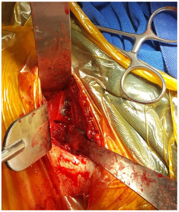 In the second phase, with the patient in a beach chair position, a deltopectoral approach is performed with an incision from the coracoid process to the anterior axillary fold. It is dissected in planes, affecting the fibers of the subscapularis muscle, or performing a tenotomy until reaching the articular capsule. The humeral neck capsule is released, and an inverted L-shaped capsulotomy is performed. It is dissected subperiostatically and the anterior glenoid and its bone defect are exposed with retractors (Figure 2a). After this, the previously obtained iliac crest graft is inserted and fixed with 2 or 3 cortical screws with washers (Figure 2b). Adequate stability of the graft is verified. Capsulotomy, ligamentorrhaphy, and reinsertion of the subscapularis tendon or suture of its muscle fibers are performed. The wound is washed, closed by planes, and covered with sterile dressings.15