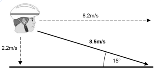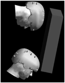A motorcycle test (UN-ECE Regulation 22.05 - Method: A (United Nations, 1995)) was used to assess bicycle helmet performance, during oblique impacts, given that BS: EN1078 (British Standards, 1997)10 considers only linear scenarios. The test aims to re-create the impact sustained during a vertical fall of 0.25 m, while travelling at approximately 30 km/h (18.64 mph) (8.2 m/s), as shown in Figure 3. This protocol has also been used to consider the experimental performance of these same helmets.23 In the AdamsTM simulation environment, this protocol translated to a drop height of 3.682 m, corresponding to 8.2 m/s, onto an impact surface inclined 15° from the vertical plane. The head form was first tested in isolation, prior to each helmet-head form construct tested against the oblique surface. Each test was repeated with the head form in three different orientations, to ensure that the impact generated head rotation in the three anatomical axes. The ‘nose-down’ impact, see Figure 4, was performed to induce sagittal plane head displacement, whilst the head form was rotated 90° for the ‘side’ impact test, to induce head rotation in the transverse plane, see Figure 5. The ‘vertex impact’ required the head form to be dropped vertically along an axis passing through both ears, causing an impact around the vertex of the head and thus, inducing head rotation about the frontal plane, see Figure 6.