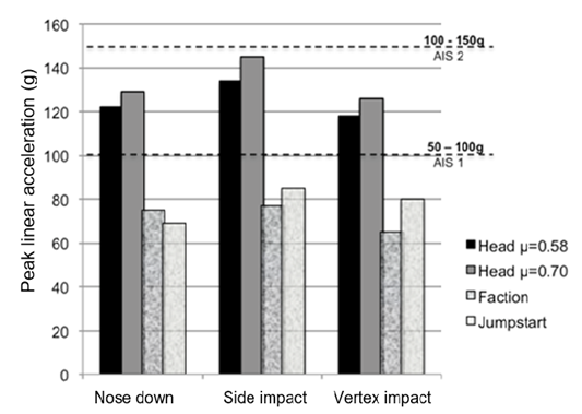 Figures 9 & 10 show the peak linear and angular accelerations observed when both helmets have modified ‘head’ properties. Angular accelerations vary more than their linear components, with the peak level at 19733 rad/s2 for the Bell JumpstartTM, a level that is 3966 rad/s2 higher than the μ = 0.7 head model, with identical contact and frictional properties. Accordingly, an increased effective head diameter does appear to increase angular acceleration levels measured at the head form centre of mass. However, this result also depends on a bicycle helmet having the same impact properties as the human head; a statement which is obviously untrue. The levels of angular acceleration observed for all impacts in Figure 8 are unsurprisingly large, since an applied Reg. 22.05 testing standard is designed for motorcycle helmets. All impacts register above the COST 327, AIS 1-2 level and most reach AIS 3-6.