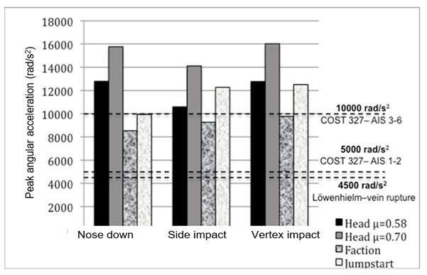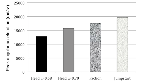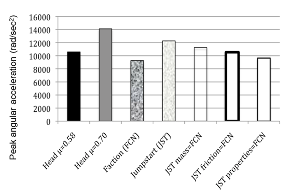 The results for angular acceleration at the head form centre of mass see Figure 8, show higher values for an un-helmeted head, than for a head form wearing a helmet in almost all cases. Interestingly, this result seems to challenge the initial hypothesis for which this study was based, that the effective increased diameter of the head would cause greater rotational torque on the brain during an impact. As shown by Figure 8, however, this is only true for a ‘side impact’, where the un-helmeted head had a co-efficient of friction equal to μ = 0.58 and the helmet (Bell JumpstartTM) produced an increased angular acceleration (1690 rad/s2). If, however, the helmet properties were modified, both in terms of stiffness and friction, to that of the μ = 0.7 head model, the initial hypothesis holds true.