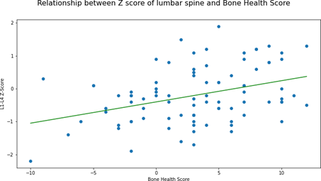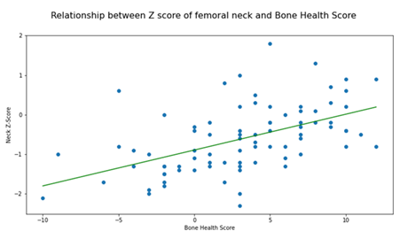 All data were assessed using the python programming language software Pandas version 1.0.3 on Zenodo and Stats models by Seabold, Skipper, and Josef Perktold. Data were interrogated for relationships between bone health score and BMD measured at the lumbar spine and femoral neck. Significance was assessed using a T-test, applied to the linear regression coefficient between continuous variables, and an F-test on the correlation coefficient, with a threshold p-value of 0.05.