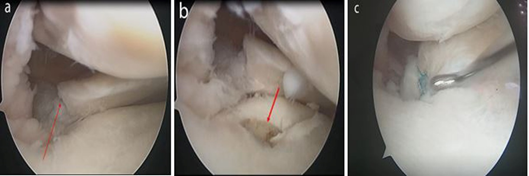 a) Medial meniscus posterior root tear (red arrow). b) Tibial socket for root fixation (red arrow). c) Medial meniscus posterior root after repair.