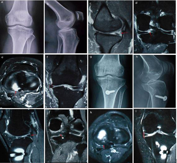 e) Axial. f) Meniscus extrusion (measured between two red vertical lines). g) Radiographs at 3 years follow up anteroposterior. h) Lateral view. i) MRI scans at 3 years follow up showing complete healing (red arrow) on sagittal view. j) Coronal view. k) Axial view. l) Coronal view showing decrease meniscus extrusion (measured between two red vertical lines)