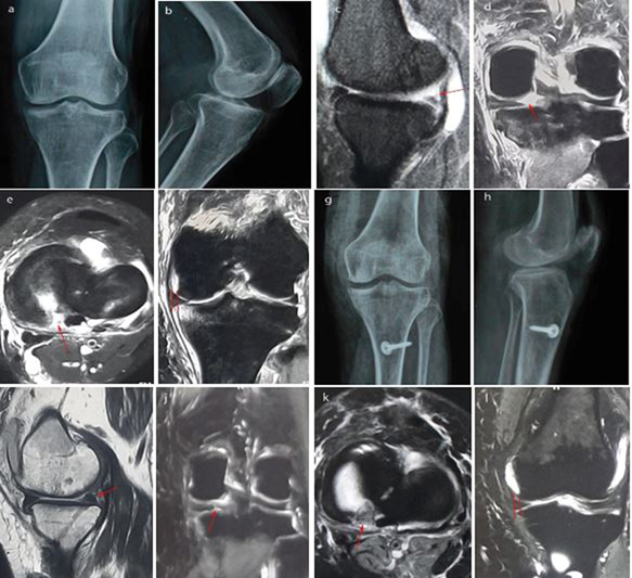 a) Anteroposterior. b) Lateral radiographs. c) Preoperative MRI showing root tear (red arrow) in sagittal. d) Coronal. e) Axial. f) Meniscus extrusion (measured between two red vertical lines). g) Radiographs at 3 years follow up anteroposterior. h) Lateral view. i) MRI scans at 3 years follow up showing partial healing (red arrow) on sagittal view. j) Coronal view. k) Axial view. l) Coronal view showing decrease meniscus extrusion (measured between two red vertical lines)
