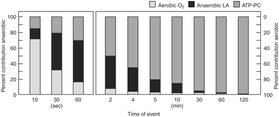 Figure 2 Time energy system continuum. Approximate relative contributions of aerobic and anaerobic energy production at maximal maintainable intensity for varying durations. The graphs assume 100% maximal oxygen uptake (O2max) at 10 minutes; 95% O2max at 30 minutes; 85% of O2max at 60 minutes; and 80% O2max at 120 minutes. Adenosine triphosphate-phosphocreatine ≤10 seconds.18