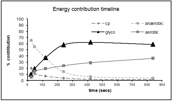 This new model of explaining the time line of pathways at maximal effort, over both short time periods (20 sec) and long time periods (up to 60 minutes), has proved to be accurate in identifying what has taken place within the race performance. Using data from this study, it has been possible to create a predictive tool that allows us to observe the individual response to high demand sporting events that matches the observations within the race. This provides an accurate tool for assessing training outcome and suitability to ensure that the athlete is correctly prepared for their target events at target competitions.62-72