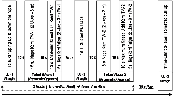 BSJT is aimed at reproducing both neuromuscular and energy demands of judo competition and verifying the performance of specific skills within a time structure similar to that of a contest. Briefly, BSJT comprises six 15-s exercise periods, separated by 10-s recovery periods and played for three consecutive bouts; and finishes with a larger 30-s recovery period followed by a “time-limit” isometric pull-up. Accordingly, total duration of the test varies from 8 to 9 minutes; depending on each subject’s ability to maintain the above-mentioned isometric pull-up. Performance in BSJT could be then assessed considering either total number of repetitions played during the test (raw BSJT total score) or number of repetitions played in each of the six drills employed; whereas final “time-limit” isometric pull-up is retained for further analysis (see statistical analysis section) but not included in raw BSJT total score. Because of the way BSJT assess some specific judo drills (i.e., Nage-komi, Uchi komi) (Figure 1) three judokas of similar body weights are needed to perform the test: 1 participant (tori) is evaluated and 2 other individuals receive throws (uke). Time structure and drills employed in the test were previously described in detail elsewhere28 (Figure 1).