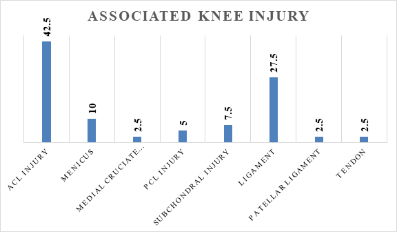 In this study found 42.5% of injuries were ACL injuries, while 10.0% were meniscus injuries. Other injuries included medial cruciate ligament (2.5%, n=1), PCL (5%, n=2), subchondral (7.5%), collateral ligament (27.5%, ), patellar (2.5%), and tendon (2.5%). Denmark had 3 ACL injuries per 10,000 people, with athletes having a higher rate.14 Sweden had 43% of all soccer-related knee injuries, and a New Zealand study found 36.9 ACL injuries per 100,000 person-years. The 40 wounded trainees were 77.5% male and 22.5% female. Women have a 2-3 fold higher risk of ACL injuries than men and tend to injure their lower legs.15 Soccer teams have 1.3% male and 3.75% female ACL injuries. ACL injuries account for 6% of match injuries and 2% of training injuries in women in the US, but less than 1% in men. Football trainees had the most injuries (32.5%), followed by cricket (17.5%), shooting (17.5%), hockey (7.5%), tennis (2.5%), gymnastics (10%), swimming, judo, and volleyball (2.5% each). Football, basketball, professional wrestling, martial arts, artistic gymnastics, and alpine skiing have higher ACL injury rates.6,15 The nature of the injuries was 90% normal spine curvature, 7.5% lordotic, and 2.5% kyphotic. Meniscus (60-75% prevalence), articular cartilage (46%), subchondral bone (80%), and entire collateral ligament (5-24%) damage are associated with ACL rips. 90% of injured individuals were hit directly during training, while 10% were hit indirectly. Most injuries were moderate (42.5%), followed by severe (10%) and mild (47.5%). 27.5% of participants did 15-minute warm-ups and cool-downs, while 40% did 20-minute ones. Shorter warm-up and cool-down times increase injury risk.16 60% received medication and physiotherapy, whereas 37.5% received simple physiotherapy. Most injured athletes receive physiotherapy, but some also need conservative or surgical treatment.17 This study examines the prevalence, demographics, injury features, and treatment patterns of ACL injuries and concomitant injuries in study participants, with references to pertinent literature.