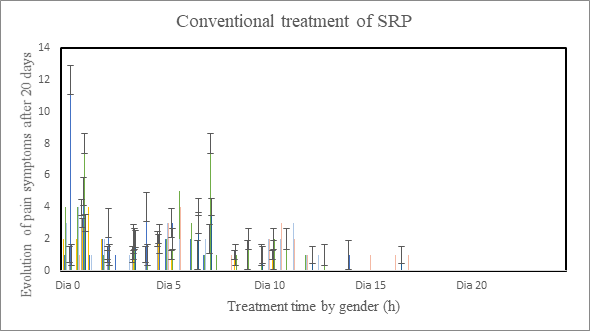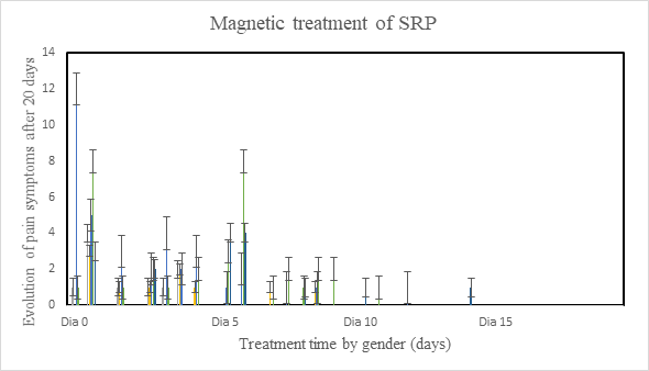 The design of the magnetic knee brace, with permanent magnets, can be used for the desired purpose since the magnetic induction B = (2.97 - 6.94) mT generated is sufficient for SRP treatment. In Figure 3 it was observed that at the beginning of the magnetic treatment the pain predominated in the group from 15 to 25 years old in the female sex (12) in the scale of 8, the male sex (8) predominated in the same age group but in the scale of 7 and before 20 days of treatment the evolution in the pain scale is from 4 to 0 and the disappearance of the pain of the patients of all the age groups is achieved, compared with the conventional treatment (Figure 4).