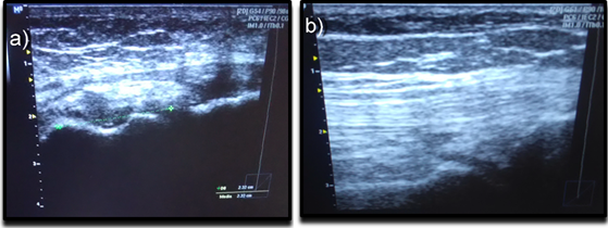 Figure 5 Ultrasound imaging for SRP therapy. a) Conventional treatment (cryotherapy + ibuprofen + dipyrone) and b) Magnetic treatment (magnetic knee brace + cryotherapy).26