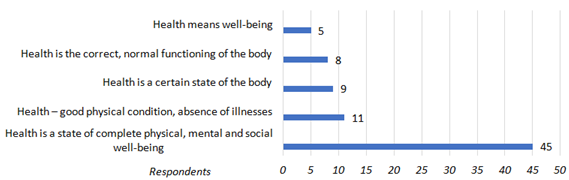 Questions about the concept of health are closely related to psychophysical resilience. The majority of respondents, (58%), who responded, described health as a state of complete physical, mental and social well-being, which is consistent with the modern definition of health (Figure 1). This indicates that this definition is quite widespread, and also suggests the personal interest of respondents in this issue.