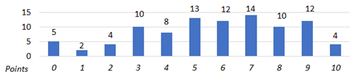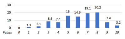 Also, respondents were asked to evaluate their psychological well-being at the moment. In general, we can conclude that in assessing the psychological state, average indicators prevail, from 5 to 7, which is 41.5% of all respondents; at the same time, 30.1% of respondents indicated their psychological well-being at a low level, from 0 to 4; and only 27.7% of participants in the sociological survey rated their inner state as 8-10 points (Figure 3).