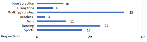 Among the types of physical activity that respondents engage in, the most popular are walking and running (35.1%), in second place is dancing (25.5%), and in third place are various sports (18.1%). The answers to the other proposed categories were distributed to a lesser extent as it follows (Figure 4).