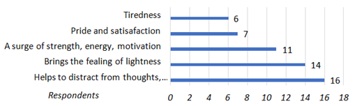 The respondents described the influence of physical activity on their own psychological state as various sensations and emotions with a positive and motivating predominance: lightness, switching attention from worries and depressing thoughts, pride and satisfaction, a surge of strength (Figure 6). However, 34 out of 94 respondents missed this question or chose not to answer it.