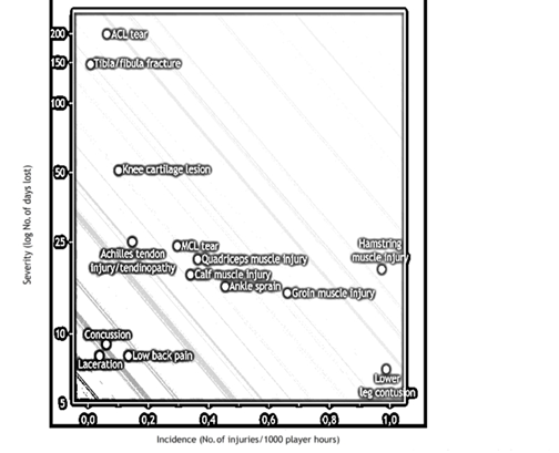 Figure 1 The incidence and severity of the main injuries in football (da Bahr et al.11 modified).