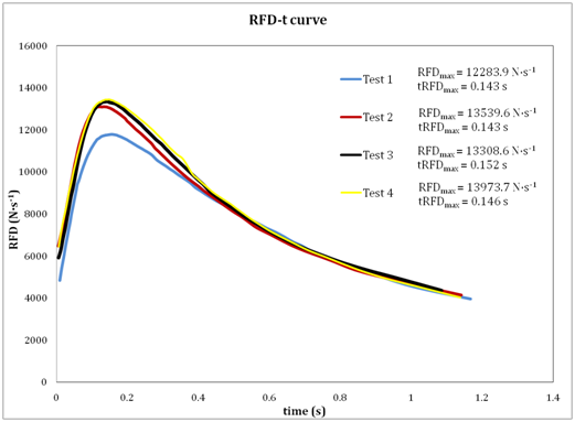 Table 3 shows the results of factor analysis (Communalities extracted on initial Eigenvalues First Component)-Component Matrix (H2). The factor analysis showed that the results of the second trial described the highest common variability for following variables: for RFD50% 0.961, for RFD100ms 0.924, for RFD180ms 0.970, for RFD250ms 0.978, while for RFDmax and tRFDmax this hapened in third trial-0.955 and 0.807, respectively. Figure 1 & 2 show the F-t and RFD-t relation of leg extensors for each made trial.