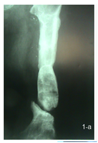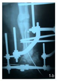 16 patients were operated by a single stage strategy with debridement of the fracture site through lateral approach with thorough excision of all infected tissues and necrotic bone and then fixation with ilizarov or uniplaner external fixation was done with acute shortening and compression at the fracture site in patients with bone defects of 2 cm or less, and use of autogenous cancellous bone graft was done in patients with bone defects more than 2 cm. (Figure 1 a, b & c).