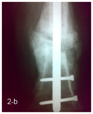 14 patients were operated by a 2 stage strategy including debridement at the fracture site through lateral approach with excision of all infected tissues and necrotic bone with no external fixation in the first session, then rest and parenteral antibiotic was given for 4 to 6 weeks and follow up with serial ESR & CRP were done before second session, 6 weeks after the first session; the second session was done through fixation by locked intra medullary nail with use of autogenous cancellous bone graft in patients with bone defects more than 2 cm (Figure 2 a, b).