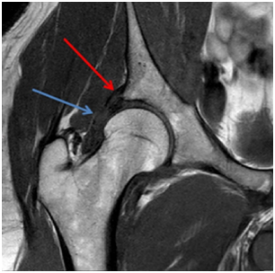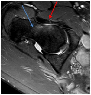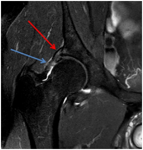 Figure 1 MRI in T2 SPIR sequence in the coronal section demonstrating labral lesion (red arrow) and partial rupture of the iliofemoral ligament (blue arrow).