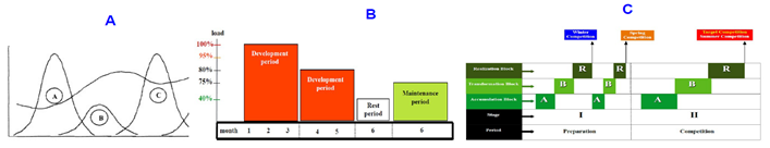 Block periodization of Verkhoshanski was elaborated for explosive strength sports of the athletics (long jump, triple jump, and high jump).34,35 Then, in 1980 block periodization was used by several athletes of the explosive strength sports in the Olympic Games.36,37 After this Olympic Games, block periodization was used in other sports.38-40 In general, block periodization is divided into three blocks of training.41 The block A the training is with the concentrated strength loads during 3 months, the block B the training is with the specific motor development in conditions similar the competition and the athlete practices explosive strength training (bodybuilding and plyometric training) during 2,5 to 3 months and the block C the athlete participates of the competitions and the coach prescribes a maintenance of the motor capacities trained (explosive strength training with bodybuilding and with the plyometric training).42,43 The duration of block C related to the competition and is the moment of the peak.