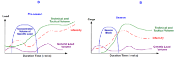 The selective load periodization of Gomes was elaborated for the soccer with the objective of training during a period an or two motor capacities.14 In this model, the volume changes little during the competitive year, except in the pre-season that it is a little lower. The intensity is usually high all year because the preparation of the athlete occurs during the competition. Therefore, there is no preparatory period, only the pre-season phase that occurs before the dispute and usually is in a few weeks.31 This model does not have the objective of establishing the athletes the peak of the sports form, but the objective is to cause a competitive regularity. The selective load periodization the coach can use in the collective sports games, in the combat sports, and in the sports arts.