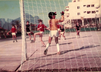 The researcher studied peripheral vision training during your master`s thesis.11 But the author of the article had the first contact with the head up training during 1981 and 1982 when the author was a young indoor soccer player. The author lived in Barra da Tijuca, a place of the Rio de Janeiro (in Brazil), with former indoor soccer players who taught young people how to practice the indoor soccer of head up. The author practiced the head up training from 1981 to 1985. Then, the author of the article started the indoor soccer of goalkeeper and after he played of a winger and/or forward. Figure 1 illustrates the author when he was goalkeeper during a championship.