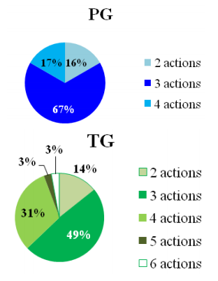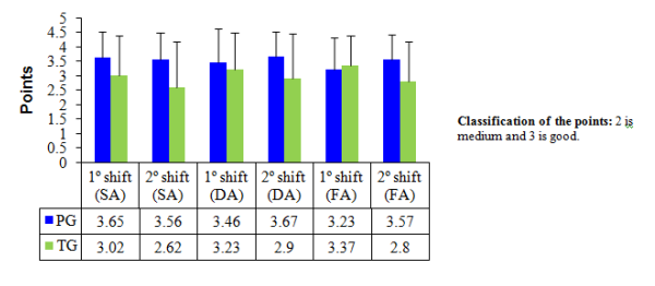 Two-way ANOVA detected a statistical difference (p≤0.05) between the PG versus the TG during the start of the attack (SA), the development of the attack (DA) and the finalization of the attack (FA). The PG was better during the SA and DA than the TG. But the TG was better during the FA of the 1st shift and the PG was better during the FA of the 2nd shift. Figure 4 illustrates the result. The indoor soccer with less offensive actions causes more goals during the match.16 Marques19 detected after of 15 sessions of the peripheral vision training the PG practiced less action during the attack and the TG practiced more actions during the attack. Figure 5 illustrates the result. However, the studies about the peripheral vision training had a limitation because the researcher did not use the Vision in Action System (VIA System) of Vickers20 or the Eye Tracking System (ET System).21 The VIA System and the ET System are used to collect ocular images of the peripheral and central vision during the match.