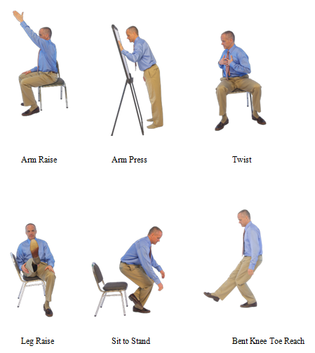 Right arm elevation 3x10 Left leg elevation seated 3 x 10 |