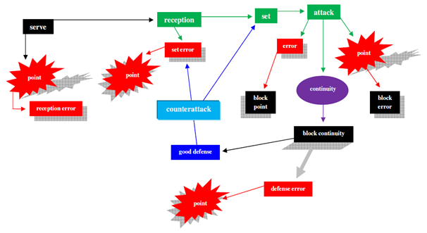 The volleyball match has a sequence of skills defined during the game.19 The serve starts the match or the volleyball player has the objective of practice a point.20 Reception and set has the action of construction and offensive development.21 The attack is the skill most decisive skill in the volleyball victory because this skill causes more points.22 The block is an important skill because practices a point or avoid the point.23 The defense has the objective of avoid the point and starts the counterattack.24 The Figure 1 illustrates the defined sequence of the skills during the volleyball match.
