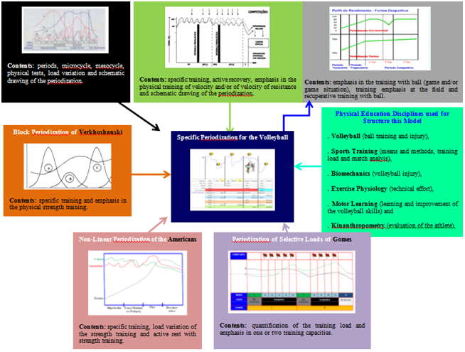 The sports periodization started during the Olympic Games of the Antiquity with the Greek athletes.1 Soviet Union had attention about the periodization after the Russian Revolution of 19172,3 and this country practiced several studies about periodization with the objective of improve this training content.4 However, the periodization for the type of sport needs to be in agreement with the characteristics of the sport.5 Then, Marques Junior6 elaborated the specific periodization for the volleyball with purpose of organizes the volleyball training. The specific periodization for the volleyball is new because this model was elaborated in 2011 (had 8 years, 2011 to 2018) by the Brazilian Marques Junior6 who played indoor volleyball and beach volleyball in Rio de Janeiro, Brazil. This periodization model has the content for improve the volleyball training with an organization of the volleyball skills during the technical training and the game situation training.7 Others types of training of the specific periodization for the volleyball are the game training and the physical training. The training load and the fatigue were monitored with subjective perception scale during the use this periodization.8 The specific periodization for the volleyball was elaborate with the influence of the traditional periodization of Matveev,9 with some contents of the structural scheme of high intensity loads of Tschiene,10 of the block periodization of Verkhoshanski,11 of the non-linear periodization elaborate by the Americans,12 of the periodization of selective loads of Gomes13 and of the tactical periodization of Vítor Frade.14 The author of the specific periodization for the volleyball used some contents these periodization models because the volleyball literature determined high performance with these types of periodization of the volleyball player.15−18 The Figure 1 illustrates the content used of others models in the specific periodization for the volleyball.