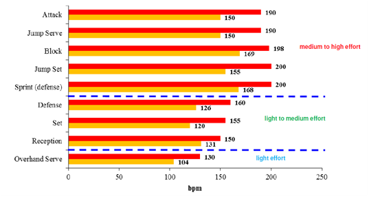 The volleyball player works a skill during the technical training with the objective of improve the biomechanics of the sports technique.25 But during the game situation training the volleyball player practices two or more skill in the sequence defined of the volleyball match (Figure 2). Then, Arruda and Hespanhol26 determined that the greatest efforts in the volleyball are the jump skills and after the defensive displacements. Therefore, training load of the technical training and of the game situation training is in accordance with the skill prescribed during the volleyball training.27 For example, tactical training and attack had highest subjective perception of effort of 6±1,6 (medium effort) of the Foster scale, in second place of the subjective perception of effort was the tactical training with 5,9±2 (medium effort), in third place was the block training with 5,8±2 (medium effort) and others.28 Tactical training occurs during the game and is with more effort. Attack and block the volleyball player needs of high jump and the athlete practices with high effort. Marques Junior8 determined the effort of each volleyball skill with the result of the heart rate in beats per minute (bpm). The Figure 3 illustrates the values.