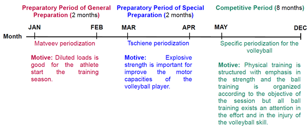 Second Rigolin da Silva31, the study on the history of each periodization model is important for the coach to know the best periodization for the volleyball (team and indoor). For example, the individualized periodization of Bondarchuk is for the hammer throw athletes32 and the high load system periodization of Vorobiev is for weightlifting.33 Then, these models are not specific to the volleyball.