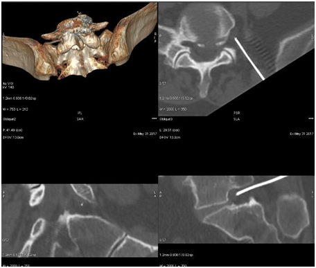 The patient placed on the abdomen, the roller under the belly at the place of planned injection should slightly widen the intervertebral space. The first scan (so-called Scout view) ensures the planning of the procedure. After the chosen area scan is performed, the needle path is planned in the target of intervertebral space. Subsequently, a 0.7/120 mm puncture needle (22G Braun) is punctured under the surface anesthesia at the exact location of the laser point - ideally in the patient's exhalation phase. After contact with the resistance of the annulus fibrosus, a control scan and 3D reconstruction are performed to determine the accuracy of the puncture. If the correct location of the needle and its path is confirmed, the steroid (diprophos) and the local anesthetic (bupivacaine) are administered. After a while, the needle is inserted into the central part of the disc and a syringe containing 20 ml of the ozone mixture at a concentration of 30 micrograms per liter is connected to the needle. Gas is slowly injected until sense of resistance of the piston (typically 3-5ml), the remaining volume of gas is left on the side wall of the disc and the vertebral body as an additional anti-inflammatory and oxygenating effect of the tissue. After placing the dressing, the patient in the lying position is taken to the observation room, where he spends 2-6 hours depending on the need. The patient is discharged with the recommendation to rest 48 hours and avoid prolonged sitting for the next 2 weeks after the procedure (Figure 2).