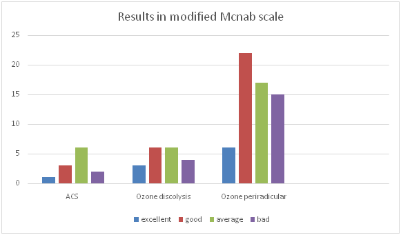 Ozone discolysis-23 patients, Periradicular ozone injection–60 patients, ACS therapy (Orthokine)-15 patients (including intradiscal-1, SI-joint -1, periradicular -13), Patients' age was 18 to 92 years, mean age 63.70. Totally 91 patients were evaluated during check- up and the results were assessed on the modified Mcnab scale, asking for the determination of the result in 4 given categories as below (Figure 4).