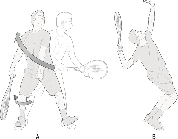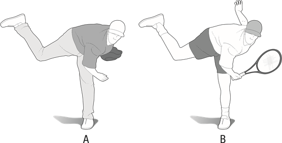 Figure 5 A. Tennis serve; B. The overhand swing, one of the four "slots" used by a baseball pitcher.