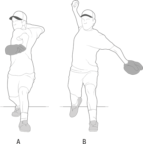 Professional pitchers have delayed trunk rotation (Figure 2A) compared to less experienced pitchers (Figure 2B). Rotating the trunk before the humerus and scapula are properly positioned leads to excessive horizontal abduction of the upper limb.4