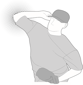 Representation of an extreme case: the thrower, at the end of the load, has his hand near the nape of his neck and his elbow pointing in the direction of the target in front of his chest. In this position, the pitcher relies almost exclusively on elbow extension rather than shoulder internal rotation.