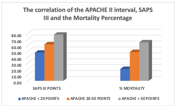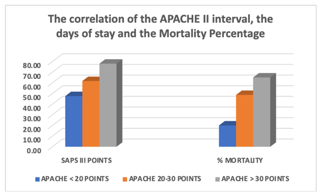 Graph 2 The correlation of the APACHE interval, the days of stay and the Mortality Percentage, observing that in patients with APACHE > 30 points, the number of days of stay was lower, also presenting a high mortality percentage, the highest number of days of stay is observed with APACHE between 20-30 points and those with less than 20 points.