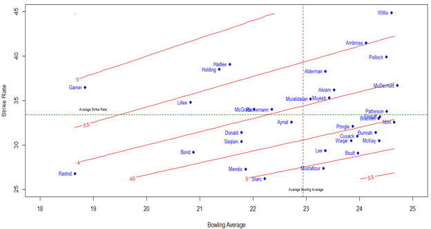 This plot, as discussed in the "About the Plot" section, is an extension of the contour plot and is a scatter plot of (Bowling Average (x) and strike Rate (y)) of the 33 bowlers superimposed over a contour plot of (Bowling Average, Strike Rate and Economy Rate). The measures of Bowling Average, Strike Rate and Economy Rate are the career figures of the selected bowlers. As none of the packages directly allow the drawing of this type of superimposed contour plot, it is programmed in the R-package. The code for the same is provided in Appendix I of the paper, and the graph is displayed in Figure 1. To classify the bowlers in terms of bowling average and strike rate two grid lines are provided perpendicular to the x-axis and y-axis, respectively. All three measures of bowling performance are negative (i.e., the lower the value, the better it is). So, from Figure 1, it can be seen that Rashid Khan, SE Bond, AA Donald, Saqlain Mushtaq, Saeed Ajmal, BAW Mendis, and MA Starc are better compared to the other bowlers in terms of Bowling Strike Rate and Bowling Average. Out of these bowlers, the Economy Rates of Rashid Khan, SE Bond, AA Donald, Saqlain Mushtaq and Saeed Ajmal are in the range of [4, 4.5]. It is further observed that most modern bowlers have a higher economy rate than the bowlers of yesteryear; this has happened as modern-day cricket has become more scoring. As the 80s and 90s batsmen were more conscious of losing their wickets, the bowlers of that era had to wait longer to get wickets. This is evident from the figure, as most of the bowlers who ruled the cricket world during that period are positioned in the upper half of the graph, with more crowding at the top left.