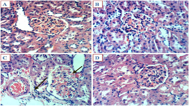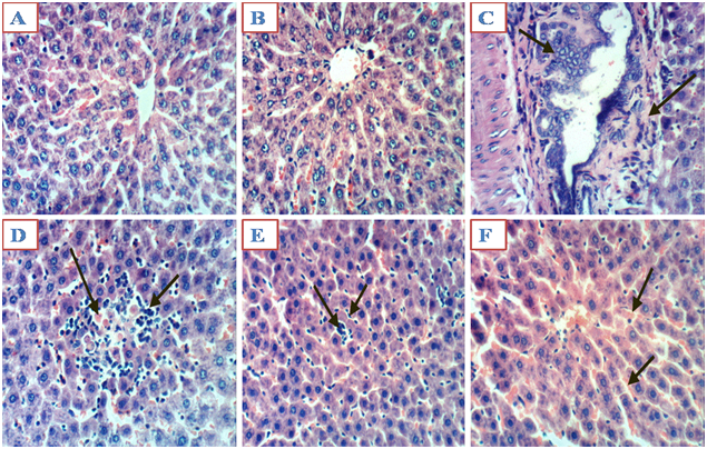 Light microscopic examination indicated a normal structure of the liver and kidneys in the controls group, and those treated with MO alone and MO plus ML (Figure 1A, 1B and 1F), (Figure 2A, 2B and 1D). However, Liver sections of animals treated with ML showed hyperplasia of epithelial lining bile duct and fibroplasia in portal canal (Figure 1C), Kupffer cell activation and focal hepatic necrosis associated with inflammatory cells infiltration (Figure 1D) and focal hepatic necrosis were associated with inflammatory cells infiltration as well as apoptosis of hepatocytes (Figure 1E) in liver. On the other hand, Kidneys sections of animals treated with ML alone showed congestion of glomerular tuft, perivascular oedema associated with inflammatory cells infiltration in kidneys (Figure 2C), (H & E X 400).
