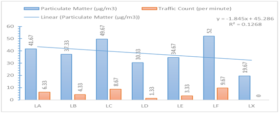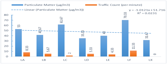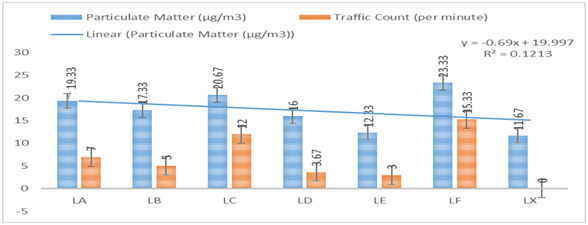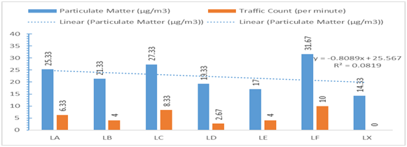 In addition, the relative humidity of the comparison site (LX), was significantly (p<0.05) low compared to the other stations in the study area (LA-LF). As presented in Table 1, the mean values of wind speed associated with the playgrounds (LA-LF), had values ranging from 0.71–2.73 m/s. Stations LF and LC had the highest and lowest values of wind speed respectively. In addition, there was a significant difference (p<0.05) amongst wind speed levels in the playgrounds with exception of stations LD and LE which had no significant difference (p>0.05), as shown in Table 1. Furthermore, the highest level of wind speed was reported in station LF, while the lowest temperature was in station LC. With exception to station LC, the wind speed of the comparison site (LX), was significantly (p<0.05) lower compared to the other stations in the study area (LA - LF). Figure 1, presents the spatial mean levels of PM1.0 particulate matter ranges from 12.33–23.33µg/m3, with a corresponding traffic count ranging from 3.00–15.33 count/minute. It was also observed that the playgrounds with the highest (LF) and lowest (LE) levels of particulate matter, were similar in trend for traffic counts as well (p>0.05). With exception of station LE and the comparison site (LX), there were significant differences amongst all the stations (p<0.05) for PM1.0. There was significant spatial variation in traffic count, with no recorded traffic counts in the comparison site.