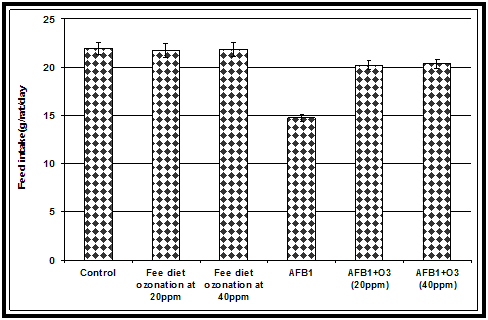 Figure 1 Effect of ozone treated AFB1-contaminated wheat alone or treated with ozone on feed intake in rats.
