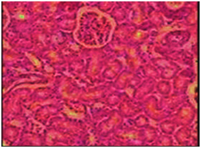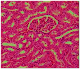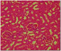 Figure 9 Section in kidney of group fed on AFB1 free diet and treated with ozone gas showing nearly normal convoluted tubules and the Bowman corpuscle (H &E 200).