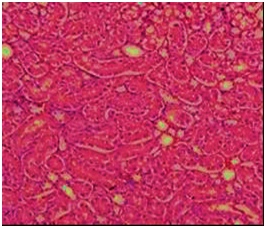 Figure 10 Section in kidney of rat fed AFB1-contaminated diet after ozonation showing significant improvements in liver tissues and normal hepatocytes (H&E 200).