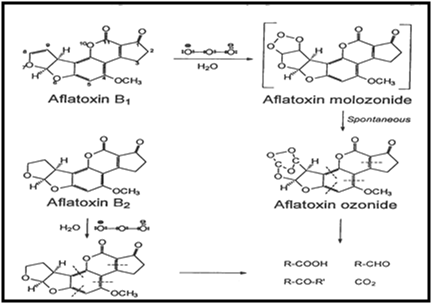 A variety of moulds routinely infect the world’s cereal crops. Under certain field or storage conditions, some moulds can produce toxin metabolites “mycotoxins“. Aflatoxins (AFs) are a group of highly carcinogenic mycotoxins produced primarily by the fungus Aspergillus flavus. Within the group of AFs, Aflatoxin B1 (AFB1) have been reported to be carcinogenic, teratogenic, tremorgenic, and dermatitic to a wide range of organisms, and known to cause hepatic carcinoma in humans1 AFB1 is the most potent of the four naturally occurring AFs because of its remarkable Hepatotoxicity and carcinogenicity, this feed contaminant has been the focus of considerable research since its discovery. AFB1 is the most potent carcinogenic substance naturally produced by Aspergillus species. AFB1 is classified by the International Agency of Research on Cancer as Group1 human carcinogen.2 AFB1 has been linked to a specific G to T transversion in the codon 249 in the p53 tumor suppressor gene in primary human hepatocellular carcinoma (HCC).3 The liver is generally the primary target organ and liver damage has been demonstrated in poultry, fish, rodents and non-human primates fed AFB1. Different species have been observed to exhibit different levels of susceptibility to aflatoxins, an example being that in rats and rainbow trout AFB1 is amongst the most potent carcinogens known, but is only either a very weak carcinogen or even non-carcinogenic in guinea pigs. AFB1 have been demonstrated to bind covalently to the N7 of guanine in DNA after P450 mediated activation of the C8-C9 vinyl ether to the highly reactive epoxide. From a toxicological point of view, it is clear that the generation of an 8, 9 epoxide of aflatoxin is an important prelude to the toxicity observed4 Cytochrome P450 enzymes located in the liver are known to convert AFB1 to compounds such as the highly reactive 8, 9 epoxide, aflatoxicol, aflatoxin Q1, aflatoxin P1, and AFM1 depending on the genetic predisposition of the species. Following its formation, the aflatoxin-8, 9-epoxide binds very rapidly to DNA and serum albumin forming aflatoxin-N7-guanine and lysine adducts, respectively.5-7 A variety of chemical, physical, and biological treatments have beentested for their ability to reduce or eliminate the AFs in contaminated feeds and foods. Ozone gas is a powerful oxidant capable of reaction with numerous chemical groups8 Ozone either completely degrades mycotoxins or causes chemical modifications, reducing their biological activity. Ozone reacts across the 8, 9 double bond of the furan ring of AFB1 through electrophilic attack,causing the formation of primary ozonides followed by rearrangement into monozonide derivatives such as aldehydes, ketones and organic acids9,10 The objective of this study was to evaluate the capability of ozone gas to decontamination of AFB1 in contaminated wheat grain and confirm detoxification using laboratory animals